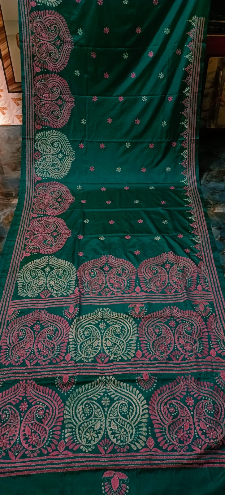 A Kantha work saree is a traditional Indian garment renowned for its intricate hand-embroidery, originating from the rural regions of Bengal, Odisha, and Tripura. The term “Kantha” translates to “patched cloth” in Sanskrit, reflecting the practice of repurposing old fabrics into new creations.